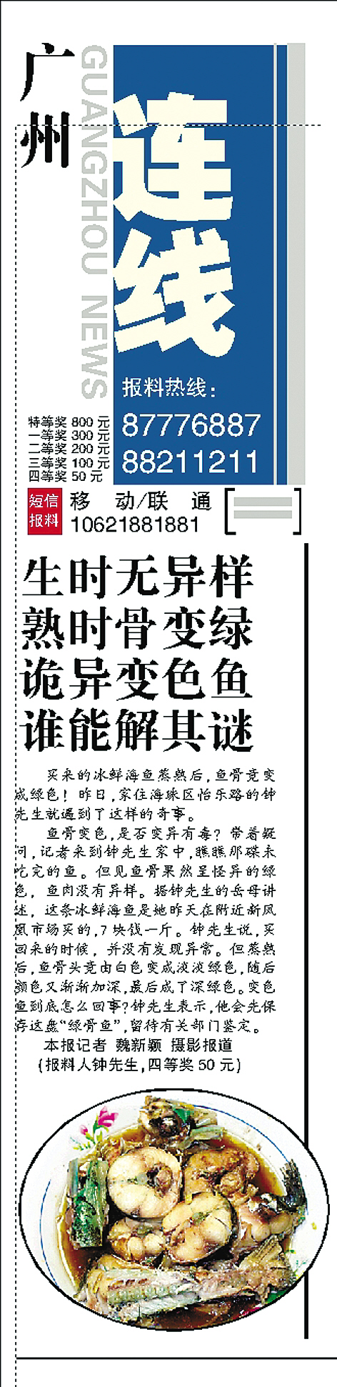 本报讯 记者魏新颖、实习生袁玥报道:本报本月7日报道了神秘“绿骨鱼”后,不少热心读者纷纷致电释疑:这种“绿骨鱼”没有毒素,自家常吃。昨日,记者向南海水产研究所有关专家求证,也得知“这种鱼骨头天生就是绿色的,没有毒性”。