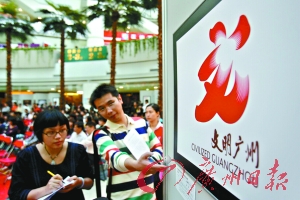 昨日一并揭晓的广州“创文”标志大赛共有5幅作品获得入围奖,其中一举夺魁的《让文明之花绽放首善之区》以广州市市花——红色的木棉花为标志主体,意指城市“文明之花”,其五个花瓣既分别代表了广州经济、政治、文化、社会、生态等5个领域,也全面展示了广州“开放、和谐、热情、健康、活力”的五种参与精神。同时,标志还巧妙地融入了行书的“文”字与“广”字,奔放飘逸的字体有力地凸显了活动的主题,展示了广州千年文明底蕴。(见下图,顾展旭摄)