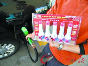 采访完梁先生后,记者走访了顺德大良、容桂多个加油站,发现90%以上的油站都出售这种不明品牌的“燃油精”,而且价格都在50元以下,推销员看见车主前来加油,就主动拿上油枪,然后热情拿出这些添加剂推销。
