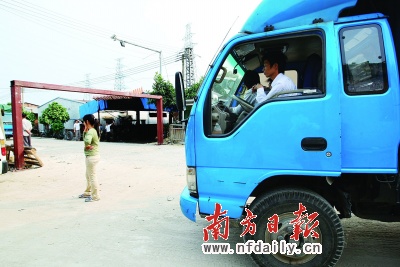 一辆货车驾驶室里的5名员工无奈地抽着烟。车厢里满满的纸托板24小时之内要运到凤岗。负责人蒋小姐说她的工厂主要给客户做库存,货一运到凤岗就要立即装车运走,所以她们特别着急。