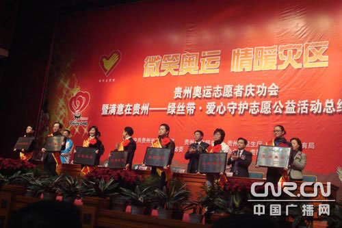 中广网贵阳11月21日消息(记者王贵山 罗胜)21日上午,在贵州省大礼堂隆重召开“贵州奥运志愿者庆功会暨‘满意在贵州’--绿丝带.爱心守护支援公益活动总结表彰会”,会上,还对在“满意在贵州--绿丝带.爱心守护”志愿公益活动中表现突出单位和个人进行了表彰。