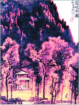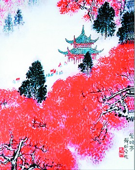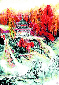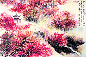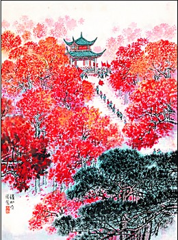 著名画家唐云的《爱晚亭》图,此图创造性地探索出新图式,表现出浑厚博大的精神力量,使之和谐融合在浑厚的传统笔墨和传统的造型意象之中。
