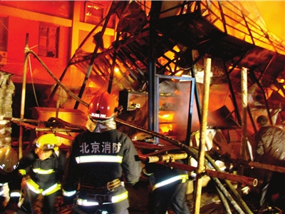 消防员在起火居民楼西侧架起3支水枪,形成水幕将两楼隔断。接着,采石路、五棵松等5个消防中队的20多辆消防车赶来增援。
