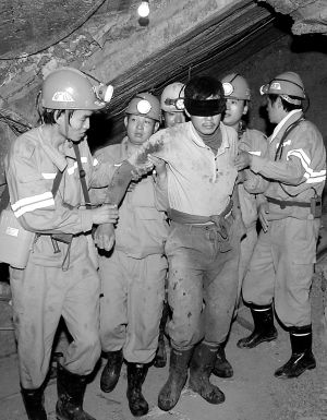 图为被困矿工卢和祥在救援人员的搀扶下走出矿井。