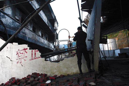 记者在事故现场看到,昨天的大火烧毁了该公司的三层半厂房,原本白色的墙体被火烧成黑色,厂房门窗的框架全被烧光,厂房内的物品也付之一炬。紧靠起火厂房旁是一个包装仓库,蓝色铁皮屋顶已被掀掉。而在起火厂房的楼下,还摆放着数十个大油桶。