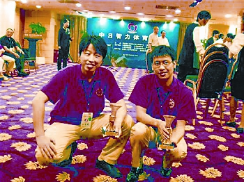 上图:胡志伟(右)和队友参加中日智力体育竞赛时的合影。