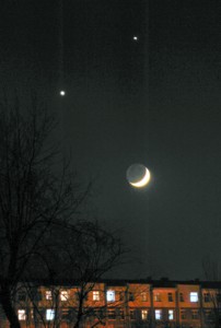 夜空出现“笑脸” 新闻晨报 2008.12.0202:34 关注 据新华社报道 这是12月1日晚在宁夏银川市拍摄的 “双星拱月”。当日傍晚,全国大部分地区的西南方天空,弯月、金星、木星熠熠生辉,形成一个锐角三角形,上演美妙的“双星拱月”天象。