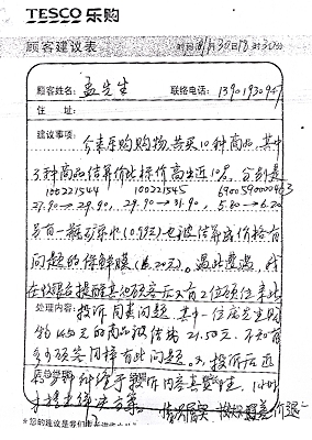 11月30日,孟先生填写了顾客建议表,投诉了乐购真北店结算价格比标价高的问题。