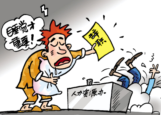别人都在为如何保住或者找到饭碗而发愁,来自重庆铜梁的大学毕业生田枫却在上班第二天,就一脚踹掉了费尽周折才谋到的薪水不菲的职位,理由是:上班要早起,不能睡懒觉。田枫说,睡得不舒服,再多钱都没精神去挣,况且,自己有能力、有文凭,不怕找不到工作。(据《重庆晚报》)