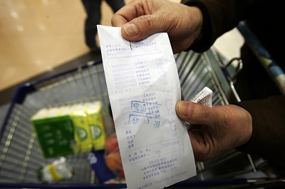 顾客展示收银条,收银价格与实际价格不符。早报见习记者 刘行喆 图