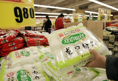 乐购卢湾店双塔龙口绿豆粉丝提前挂出促销价。