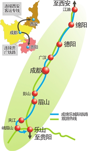 从成都出发,坐火车前往绵阳、乐山将不会超过1个小时,两小时内可穿越省内10个城市。作为四川第一条城际快速客运专用通道,成绵乐城际铁路按照规划将于本月开工,建设总工期约48个月,预计2012年正式通车。该线路建成后,将加速成都、德阳、绵阳等重灾区恢复重建,并形成一个环线旅游经济带。