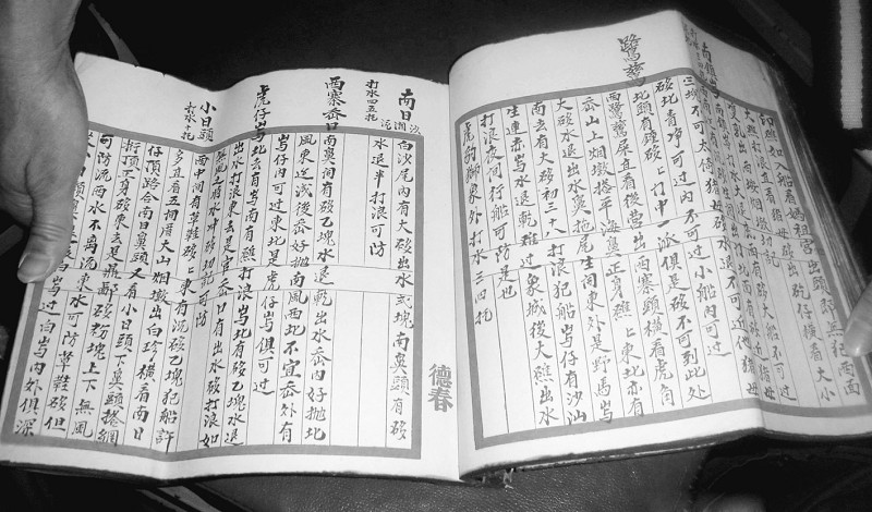 此《航海路针图》是蔡先生早年从石狮永宁一船工手中购得的。是清朝道光年间一名长期从事对台货船航行的船工用毛笔一字一字记录下来的。记者看到,“航海图”是一本线装的毛笔字手写本,有一百多页。《航海路针图》上记载着从泉州港、厦门港和漳州港甚至包括澳门、广州港等港口出发到各地的航海线路、时间以及各条航海线的注意事项,均是用古早的闽南方言记录的,非常生僻,还有一些词语是行船的专业术语。