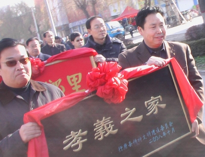 尽管昨天的天气有些寒冷,但震天的锣鼓声激起了行唐县城街头许多围观市民的热情,行唐县以及张建霞所在的龙州镇两级党委、政府派出县文明办主任郄金环、龙州镇镇长曲中敏等几个官员抬着“孝义之家”、“孝旌乡里”两块匾额,在锣鼓的引领下穿过闹市,来到张建霞经营的小旅馆门口,隆重悬挂,引得围观的群众交口称赞。