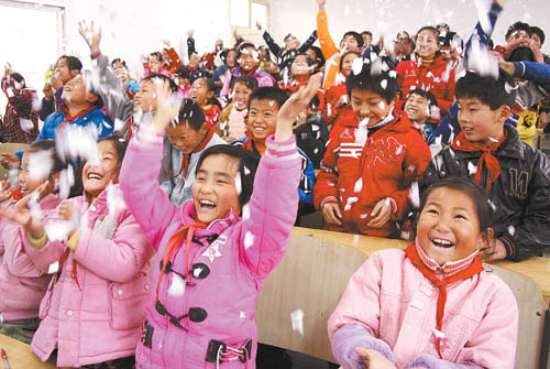 12月5日,安徽省含山县陶厂镇关镇小学的留守学生在心理咨询师的指导下,将写着心中烦恼的纸片撕碎后抛向空中。