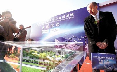 □奠基仪式上展出了公务机基地的模型 ■什么是公务机 公务航空是按照某一旅客或机构的特殊要求,通过专门设计的航线,在约定时间内,向旅客 提供包机飞行服务。许多大公司使用公务机运送人员和紧急物品到分布在各地的公司或客户地点。目前全世界在飞的民用飞机总数约为38万架,但航班飞机不到10%,90%以上都是公务机和工业、农业、娱乐及体育用飞机。 晨报记者 殷立勤 现场图片