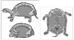 大多数的龟类都在甲板的外层覆盖有被称为“盾片”的角质层,这些盾片是它表皮的一部分。构成盾片的材料是被称为“角蛋白”的纤维状蛋白质,它也是其他爬行类动物鳞片的构成物质。这些盾片大大加强了甲壳的强度。不过有的龟类没有长出角质的“盾片”,盖在骨质甲板上的是革质皮肤,其中我们最熟悉的是“鳖”。它的“壳”就是皮质的,英文管“鳖”叫软壳龟。