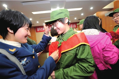 清华送新兵 长安街知事 2008.12.0902:21 关注 昨天,在清华大学学生新兵送行仪式上,接兵部队负责人为“学生兵”陈熹整理服装。今年,清华大学共有12名在校生报名参军,最终有3名本科生通过审核如愿入伍。 本报记者范继文 周逸梅摄影报道