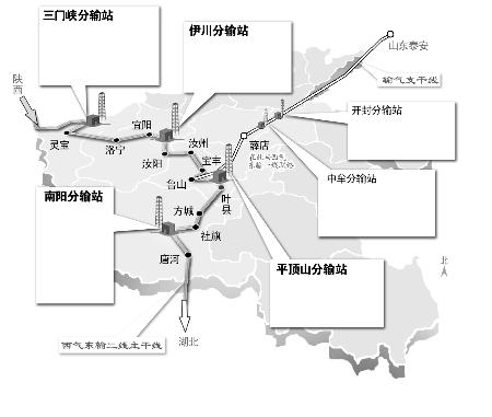 西气东输二线给我省三门峡、伊川、平顶山与南阳4个地方各设计了一座分输站。同时,为方便郑州、开封、商丘等地用气,并通过我省向山东境内部分城市供气,中石油还在河南境内规划了一条输气支干线。线路由鲁山—薛店—开封至山东泰安,在薛店与西气东输一线管道实现联络。