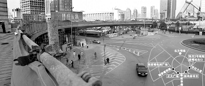被称为“明珠环”的陆家嘴天桥,目前已架设了100多米长的钢箱梁。 制图 赵佳峰 摄影 王炬亮