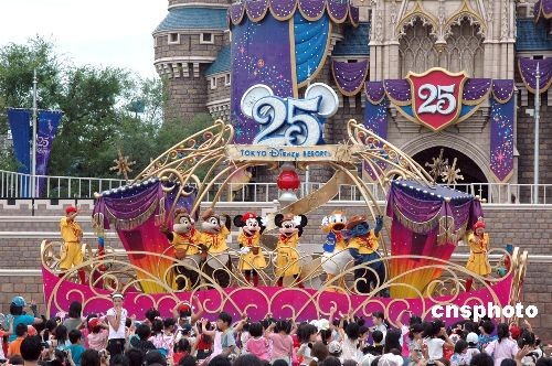 资料图:在东京迪斯尼乐园内举办的大型庆祝开园25周年表演吸引了大量游客前来观看。中新社发 关妍 摄
