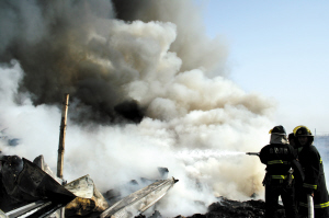 市场报讯(记者 宋才华 李超钰 文/图) 昨日上午9时30分左右,省城包河区烟墩镇政府所在地的合界高速公路旁边,一家四五百平方米的废品收购站突然发生大火,几里外就能看到滚滚浓烟。接到报警后,合肥市消防支队共出动8个中队26辆次消防车奔赴火场。经过3个多小时的奋战,火势被控制,大火没有殃及旁边一家收购站。由于风向使然,滚滚浓烟全部飘向南边,未给高速公路行车带来影响。