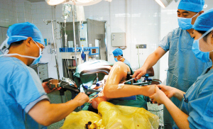 左髋关节的手术在中午12点多结束,经过半个多小时观察后,医生马上为艳华右侧动手术。有了左侧手术的经验后,艳华的血压一直维持得非常稳定,由于处理得当,出血量也比想象中大大减少。下午5点多,右膝关节的手术开始了,医护人员已经在手术台旁站立了8个多小时,但是操作的速度丝毫没有降低。晚上7点40分,完成了最后的缝合后,林博文终于舒了口气,露出了会心的微笑,3个新的人工关节已经“长”在了艳华身上,与艳华的骨头完美地结合在了一起。