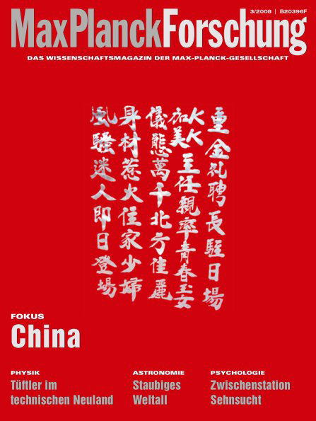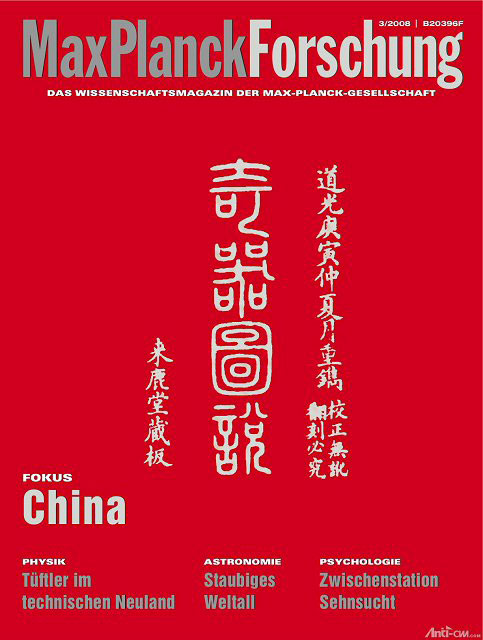 最近一期(3/2008)《马普研究所期刊》德文版的封面上使用了一些中文字。这些中文字是我们编辑部挑选的,旨在象征性地说明本期杂志的“中国”主题。令人遗憾的是,现在据传这些中文字包含有一些具有暗示性质的不雅内容。