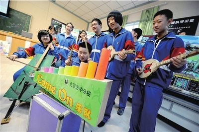 环保乐队 京华时报 2008.12.1202:07 关注 纸牌做的笛子、羽毛球桶制作的竖鼓、羽毛球拍做的琴……昨天,五中分校的环保乐队用这些“环保乐器”奏响优美的民乐,为参加12月10日开幕的第三届北京青少年文化创意节现场演奏排练。本报记者张斌郭爱娣摄影报道