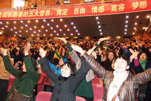 “太好了!我能行!我帮你!”演讲进行到最后,卢勤和现场的家长朋友玩起了互动,家长们高举双手跟着她的手势大声的叫喊着。“你真棒!我要学!我思考!”——快乐的喊出精彩人生九个字后,在场的家长感觉到自己忽然如释重负,纷纷表示卢勤的演讲给他们上了深刻的一课,以前自己对孩子的教育方式太苛刻了,之后与孩子要与孩子多沟通,尽可能给孩子空间去完成他们的梦想。