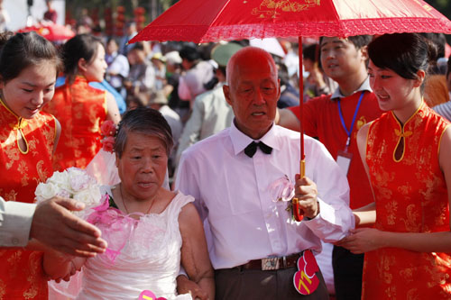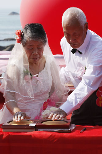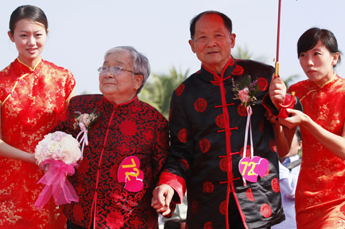 南海网12月12日三亚消息(本网记者吴文霞):参加第12届中国三亚天涯海角国际婚庆节99对伉俪中,一对来自新疆乌鲁木齐的钻石婚夫妇范迎珍、李兰英格外引人注意。12月12日上午9时50分左右,在浪漫的音乐声中,两位老人缓缓走过铺开的红地毯,迈向爱情广场。这是本届参加婚侣中年龄最大的夫妇,今年正是他们结婚的67周年。两人爱的感言:相约一生。
