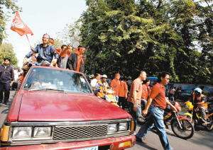 他信支持者高呼口号