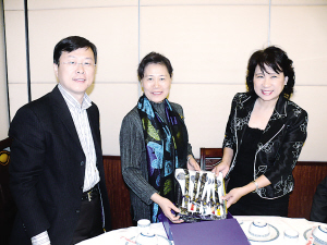 乔红(中)向陈筱玲(右)赠送纪念品,祝贺她成功当选德州议员,左为副总领事周鼎。 (美国《侨报》/聿惟摄)