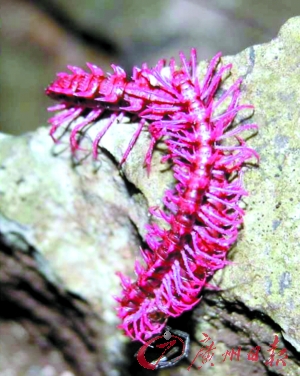 这次公布的新物种中最奇特的要数一种名叫“红龙”的动物,2007年在泰国首次发现。这是一种类似于蜈蚣的动物,它具有非常鲜艳的体色。