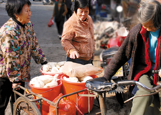 种葛打成粉是开平城乡近百年来的一个传统,但今年冬天因葛根量多价平,却格外大热起来。进入12月,每天清晨,种葛的农民将生葛挑进城里卖,见每市斤仅不到一元,比往年便宜一半,城里的市民便一担一担地买起来。前天上午,记者在开平市区的幸福市场附近,见到附近乡下的农户将刚采收的葛根挑进城,甫一放下担,来买菜的三位主妇便对肥大壮实的靓葛大感兴趣。她们每人各买了350市斤葛,请农民挑到幸福市场附近的一个加工点加工成葛粉。其中一位背着小孩的主妇笑说:“现在连吃奶粉都会出事,葛粉既便宜又有益,给小孩子吃好过喂米糊啦!”