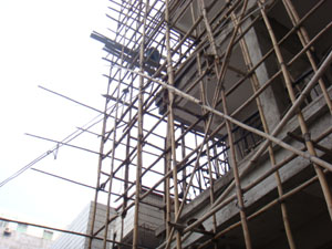 昨天下午2时,记者在凤翔路一家在建楼房的现场看到,三四名工人正在五楼的竹制脚手架上工作,有的工人在负责运送水泥,还有几名工人用木板把墙上的水泥抹平,他们走在毛竹搭建的脚手架上面时,竹子吱吱作响,一层层的竹架上不断有水泥泥浆掉落,而下面运送水泥砖块的女工则不顾头顶掉落的东西埋头干活。据现场的一名工人介绍,该楼房已经修建了7层,主体工程已经完成。