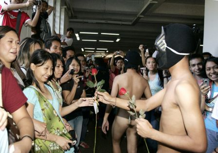 当天,菲律宾大学校园内,由该校兄弟会组织的39名男学生头戴面具集体裸奔,并向一路惊叫的女生送玫瑰。