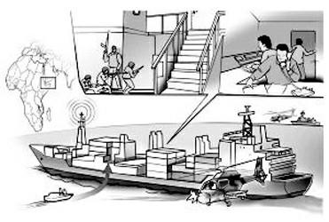 不一会,7名携带武器的海盗登上了甲板。他们冲过138米长的甲板,冲到驾驶楼下,发现铁梯已被割断,3名歹徒用自带的轻便铝合金梯攀爬上来,不料,驾驶楼底层的生活舱门早已反锁,且是厚厚的水密门,怎么撞也撞不开。恼羞成怒的歹徒发疯般地用冲锋枪对准锁孔乱射,却还是白费功夫。