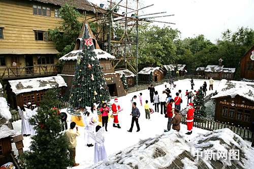 记者在广东顺德长鹿农庄看到,这座山寨版圣诞老人村子上空正飘洒着晶莹雪白的“雪花”,整个圣诞老人村银装索裹,不少游客和天使打扮的美女们正在村内游玩,令人仿佛置身于北国雪域之中。