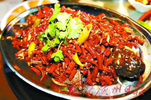 厨师点评:火把鱼以泡椒,干辣椒,蒜片,香辣酱等几种辣椒作为调味料,先将这些调味品炸脆,保留其热气,同时也将鲤鱼通过油锅炸脆,等到鱼味道鲜香四溢的时候,将这些调味料洒上去,一道视觉效果很好的彝家火把鱼就可以上桌了。