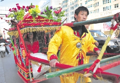 本报讯“新娘子坐在轿车里,别人也看不到长啥样子,其实很多老百姓都想看看新娘子的长相。坐轿子结婚没有啥挡的,谁都能看到,我看我老婆坐轿子挺幸福开心的。”赵俊龙昨天与韩颖结婚,他们选择坐轿子,都很高兴,因为这样环保又省钱。