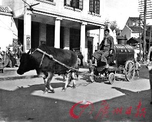 在这张老照片前,画面表述的是:上世纪40年代,江门的大街上,出现了由政府组织成立的“水车队”,一辆车、一头牛、一个驾车队员,一路吆喝着牛儿大摇大摆地走在大街上,水从后面车厢滴滴答答往下掉,一个调皮的小男孩,紧跟在水车的后面,挽起裤脚,光着脚丫戏起水来。