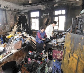 夫妇俩在大火洗劫后的房间里寻找还能用的东西