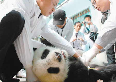 大熊猫“小明”是陕西省珍稀野生动物抢救饲养研究中心去年3月21日在太白县黄柏源乡大箭沟抢救的一只20岁雄性大熊猫,当时“小明”病情十分严重,右眼已萎缩失明,左眼患有严重的白内障,即使在人工饲养的条件下,也无法正常进食,对其生存造成很大影响。为提高“小明”生活质量,西安古城眼科医院昨日给“小明”实施了白内障摘除手术。