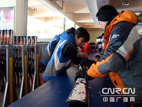 工作人员为滑雪者调试滑雪板
