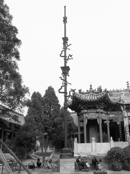 周口关帝庙铁旗杆底座上的“三鱼共一头”图案,喻指着周口是沙河、颍河、贾鲁河三河交汇之地。图为周口关帝庙铁旗杆。