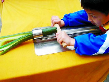 天心区沙湖桥小学苏航发明的黄瓜条快速切割器富有童真童趣。(资料照片)