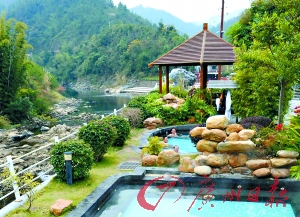 经过长途旅行,泡温泉正好能舒缓满身的疲惫。尤其是住进水上别墅时,眼底下有花有水有鱼,仿佛身处江南水乡。眺望远处,有崇山峻岭,也有田园风光,令人怀疑自己是否到了“世外桃源”。