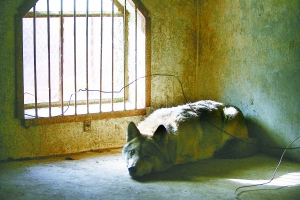 昨日中午,孤狼趴在狼舍的角落,显得很温顺。当日下午,孤狼开始进食。 记者 王嘉宁 摄