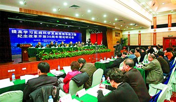 昨日上午,提高学习实践科学发展观领导能力暨纪念改革开放三十周年理论研讨会现场。 陈飞 摄